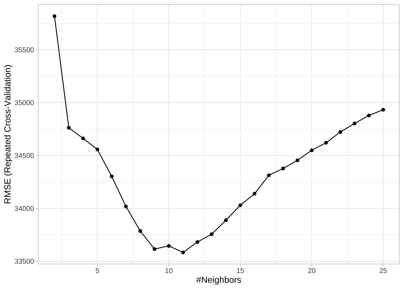 查看结果,发现最佳模型是k=9,交叉验证的RMSE为33582.40。与上面2.7中未进行变量预处理的模型(均方根误差为43846.05)相比,特征工程将预测误差减少约10000美元。