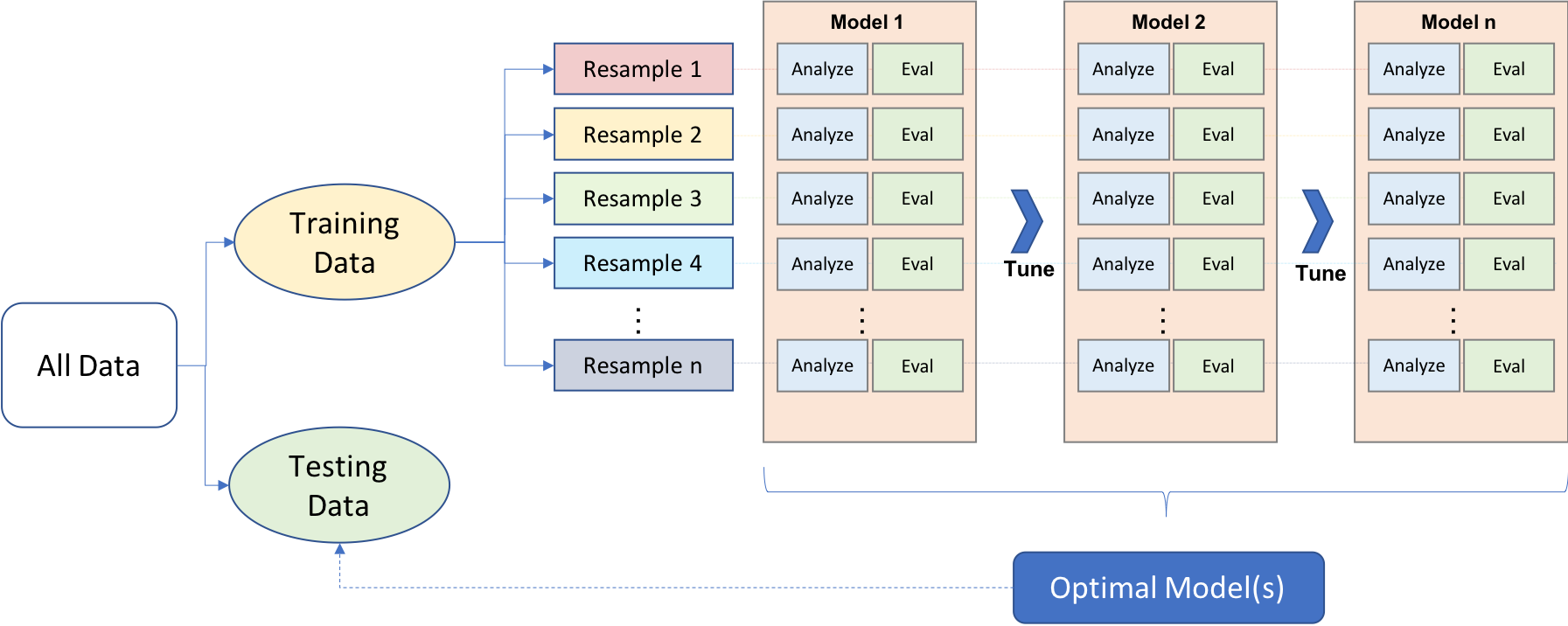 和探索性数据分析(EDA)类似,机器学习(ML)的建模过程常常是不断摸索迭代的过程。在对问题或数据缺乏充分了解的情况下,很难一开始就确定哪种机器学习方法效果最好。因此,实践中往往需要尝试、评估和修改多种方法,才能最终确定一个最优模型。