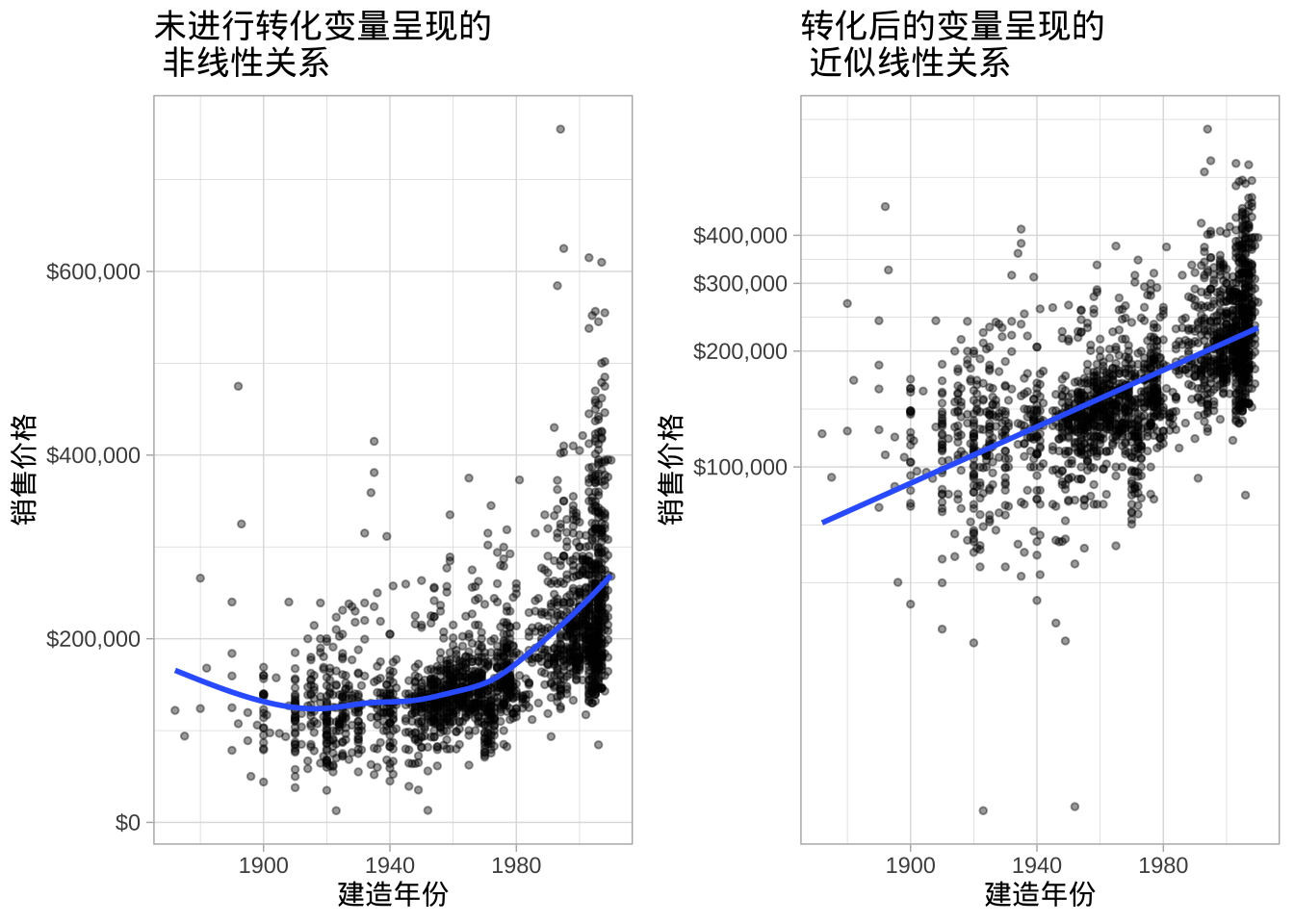 ## -2.103e+06 9.383e+01 1.087e+03回归系数的LS估计为 \(\hat{\beta}_1 = 93.8\) 和 \(\hat{\beta}_2 = 1087\)。解释为在保持房屋建造年份不变的情况下,地上居住面积每增加一平方英尺,平均售价增加93.8美元。同样,在保持地上居住面积不变的情况下,房屋建造年份每晚一年,平均售价增加约1087美元。