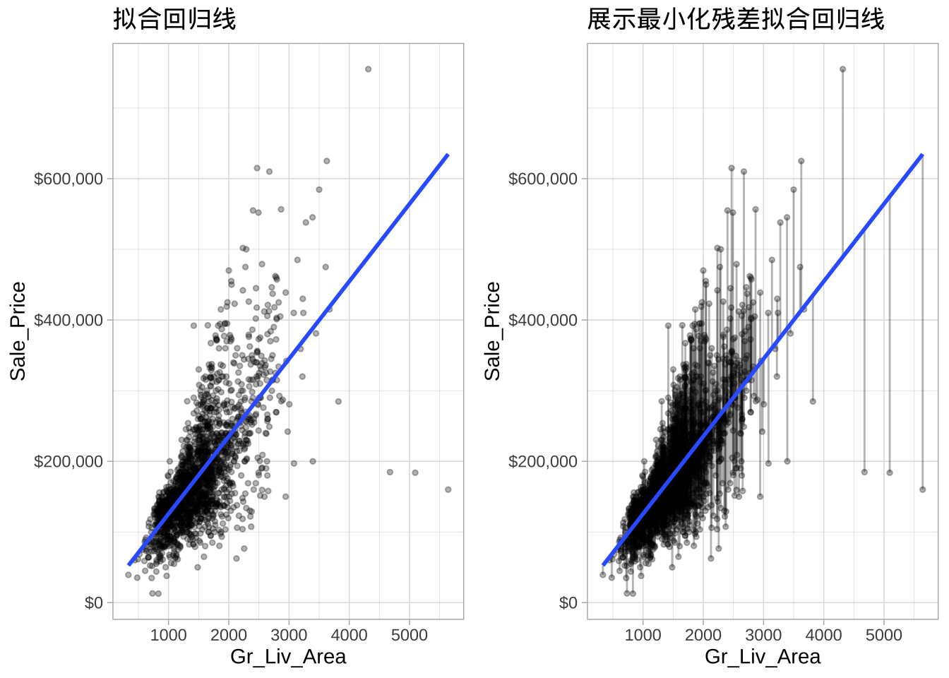 以Ames住房数据为例,建模房屋地上总居住面积(Gr_Liv_Area)与售价(Sale_Price)之间的线性关系。