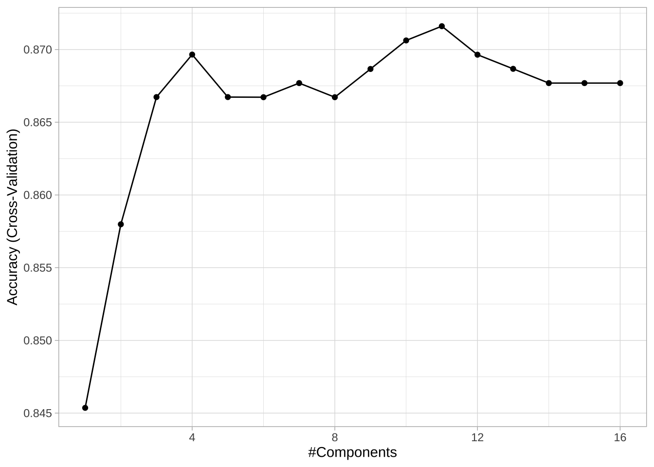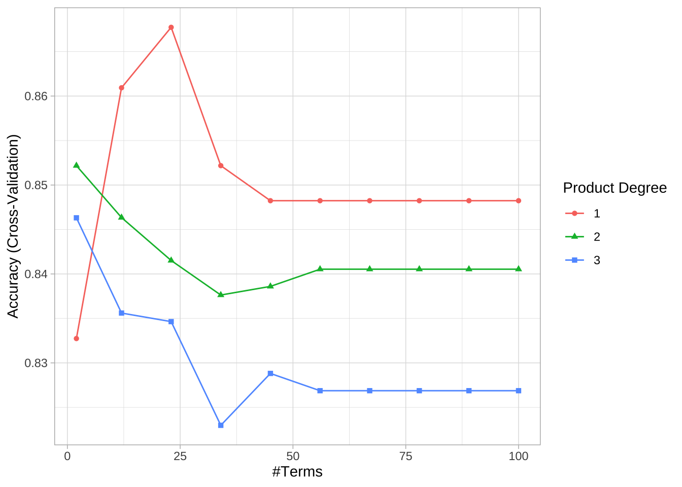 网格搜索中30种不同超参数组合的交叉验证准确率。最佳模型保留23个项,不包含交互效应。但是,MARS模型与之前的线性模型(逻辑回归和正则化回归)相比,没有看到整体准确率的改善。