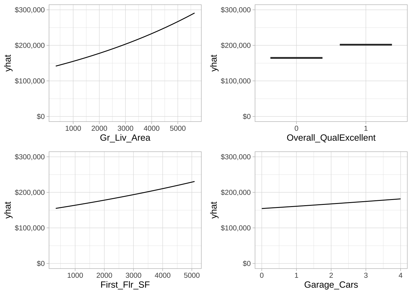 变量重要性仅测量特征纳入模型时对预测误差的影响,并不测量特征所创建的铰链函数的影响。为了更好地理解这些特征与Sale_Price之间的关系,可以为每个特征单独创建部分依赖图(PDPs),也可以创建两个特征的联合依赖图。