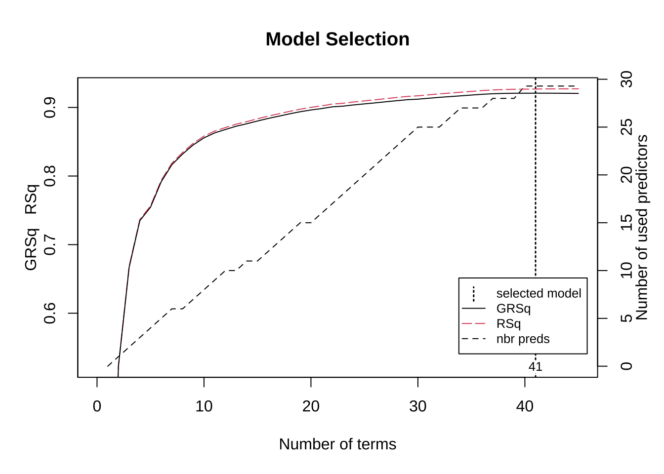 ## Overall_QualExcellent 73257.41159可以通过绘图方法(plot)对MARS模型性能进行呈现。图中展示了模型选择图,绘制了模型中的基函数项数(x轴)的GCV \(R^2\)(左侧y轴和黑色实线)的关系,以及基函数项数与原始预测变量数(右侧y轴和黑色虚线)的关系,垂直虚线则指示最佳基函数项数,在此点上GCV \(R^2\)的边际增量小于0.001。