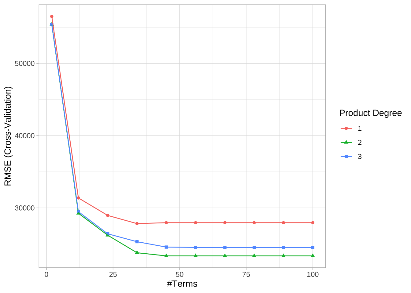 ## 6 3 12使用caret执行10折CV的网格搜索。结果显示最佳组合的模型包括二阶交互效应,并保留56个项,最佳模型的交叉验证RMSE为23363.42美元。