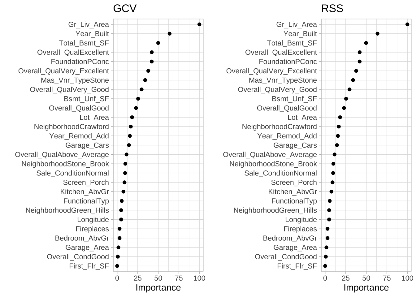 通过earth::earth()拟合的MARS模型包括一个向后剔除特征的选择程序(修剪),该程序检查添加每个预测变量时GCV误差估计的减少量,将其作为变量重要性度量。另一种重要性度量是添加项时残差平方和(RSS)的变化。这两种方法之间的差异很小。