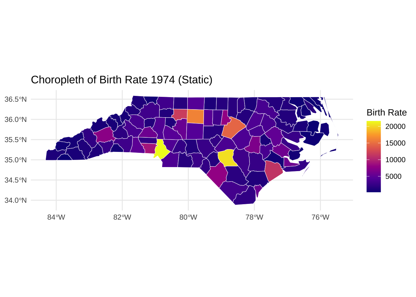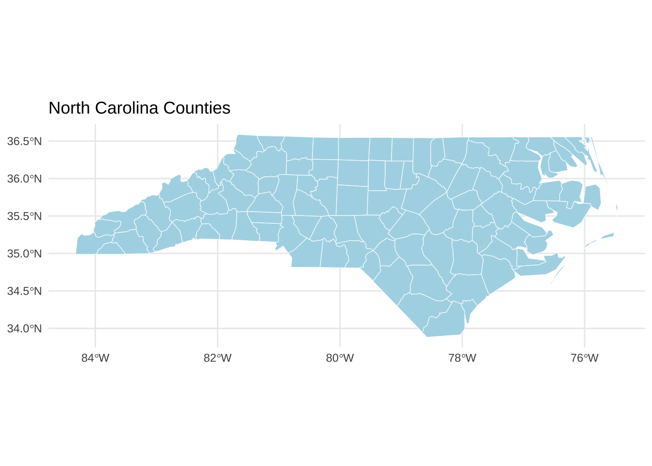 ggplot (nc) + geom_sf (fill = "lightblue" , color = "white" ) + theme_minimal () + labs (title = "North Carolina Counties" )