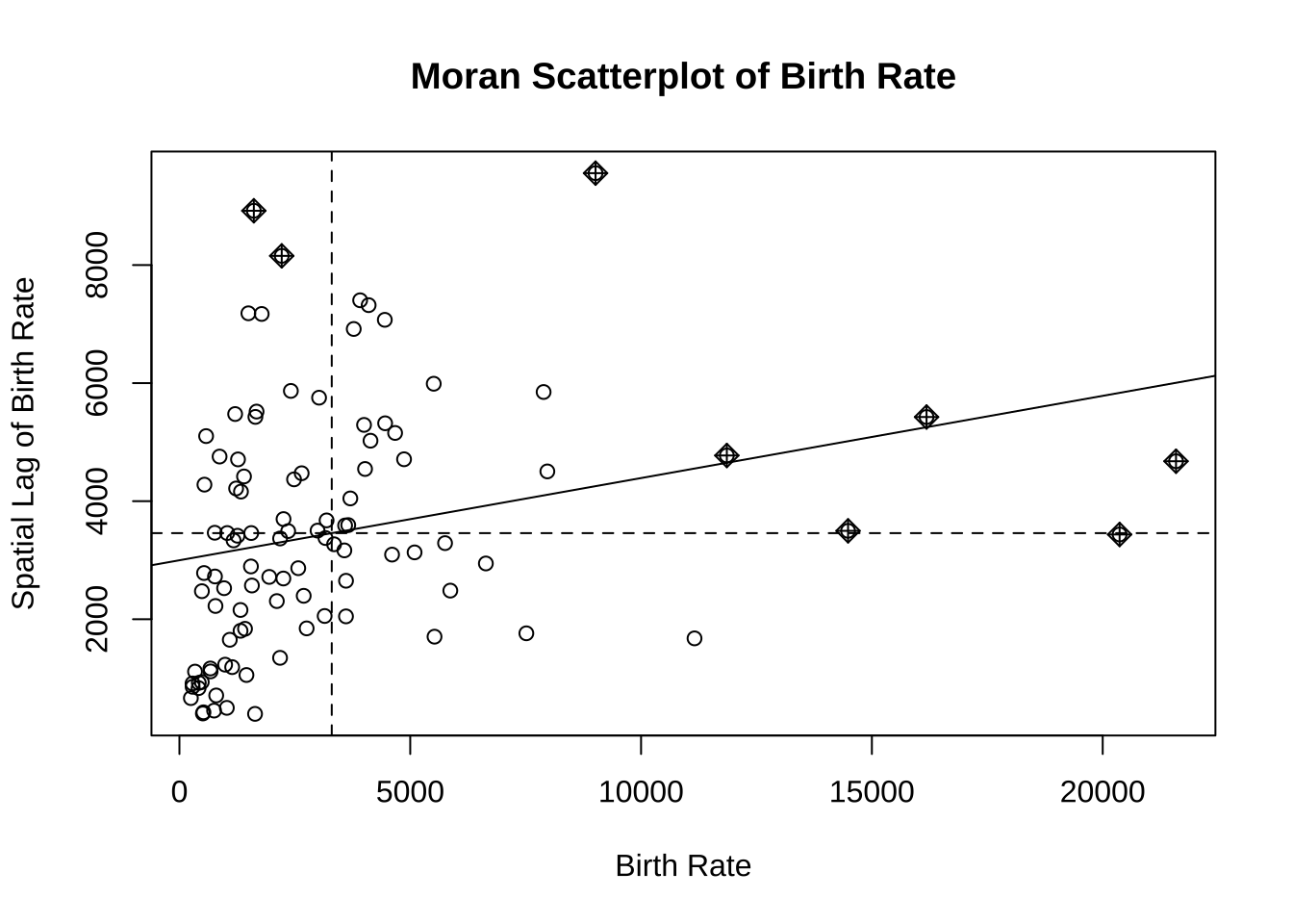 +1 表示完全聚集(正相关,高-高/低-低)